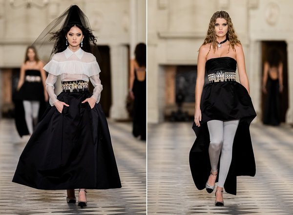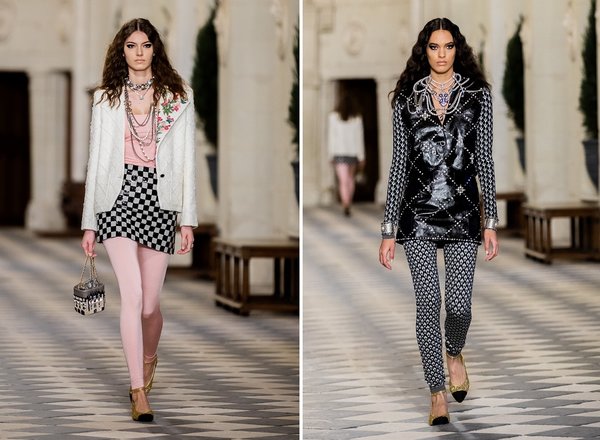 والآن لنتكلّم عن الأزياء تحديداً حيث نشير إلى عودة واضحة للقماش المقطع بالمربعات Checkered وتحديداً بلونيّ الأبيض والأسود أو الأسود مع الرمادي والذي رأيناه مسيطراً. كذلك، لنسلّط الضوء على موضة الليغينغ تحت الفساتين القصيرة التي يبدو أنها عائدة وأيضاً على هيمنة جديدة للتنانير والفساتين الماكسي.