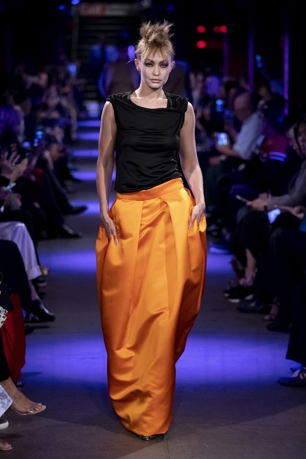 وسرقت عارضة الأزياء العالمية جيجي حديد الأضواء بإطلالاتها، إذ ظهرت في المرّة الأولى وهي ترتدي تنورة من الساتان باللون البرتقالي النيون تزيّنت بكسرات عريضة مع بلوزة سوداء. أما إطلالتها الثانية، فكانت ساحرة إذ اختارت تنورة طويلة مع توب بكتف واحد تميّزت بلونها اللامع.