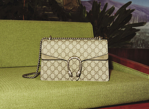 واستناداً إلى الميثولوجيا الإغريقية القديمة، يُقال إنّ الإله اليوناني "ديونيسوس" قد عبر نهر دجلة على ظهر نمر أرسله إليه "زيوس". من هنا، طُرحت لأوّل مرّة حقيبة Dionysus الأيقونيّة، التي أصبحت مفضّلة ولا غنى عنها في جميع أنحاء العالم، ضمن مجموعة خريف وشتاء 2015، وتتميّز برأسَي نمرَين على شكل حدوة. ويكمن جمال هذه الحقيبة في جاذبيّتها الكلاسيكيّة المميّزة التي أُضيف أليها لمسة عصرية، بحيث دُمجت عناصر الدار القديمة والجديدة مع بعضها البعض. وتمّ طرحها بأحجام مختلفة وبعدد من الأقمشة المتنوّعة، وأصبحت هذه الحقيبة الكلاسيكيّة والمعاصرة في آن، إحدى أفضل السلع الأيقونيّة الصادرة عن هذه العلامة التجارية بدون أي شك.