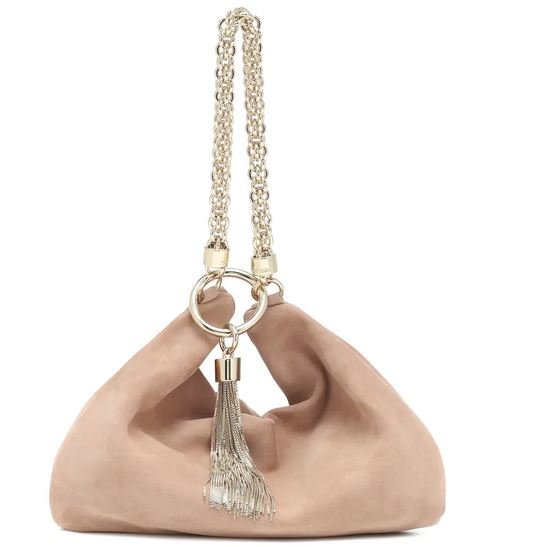 شنطة سهرة صغيرة باللون البيج مع سلسلة مميزة لحمل الشنطة بالإضافة إلى شكل وحجم جميلين.