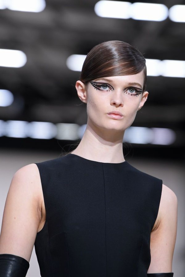 لفّ نوع من الغموض الجمالي عرض Valentino. فمع تسريحات الكعكة المنخفضة المشدودة واللون الأسود القاتم، لاحظنا أسلوباً غريباً في تطبيق الآيلاينر الذي جاء مجنّحاً بخطين واضحين للغاية مع بعض النقاط السوداء المرسومة بالقلم ذاته أيضاً.