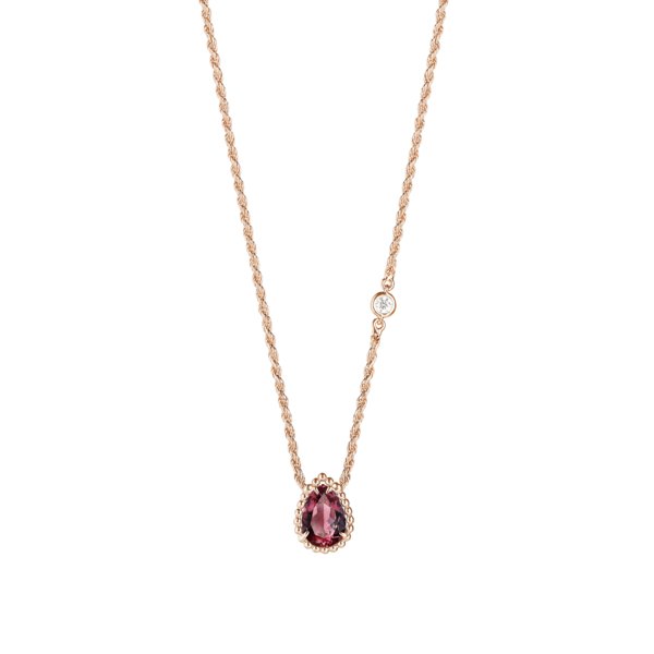تم دمج قطرة رائعة من عقيق الرودوليت متوّجة بخرز من الذهب الوردي مع سلسلة ذهبية مزيّنة بماسة صغيرة من القطع المستدير.