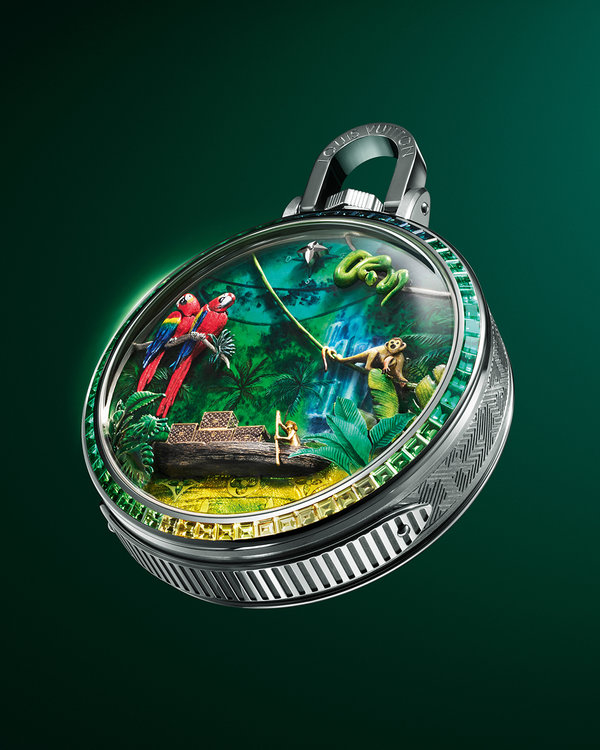 تبدأ القصة مع ساعة الجيب Escale en Amazonie، حيث تستيقظ غابات الأمازون الساحرة على ميناء مرسوم بالمينا الغنية. قوارب، وحيوانات، وخزائن تنبض بالحياة بفضل آلية معقدة تضم 555 قطعة، صنعت بدقة يدوية في جنيف، لترسم على المعصم قصيدة عن المغامرة والحلم.