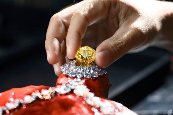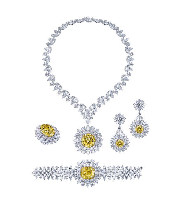 وفي كلّ مجموعة تكشف عنها، تخطف الأنظار وآخرها طقم "معوّض دراغون" الذي يضمّ أكبر ماسة صفراء زاهية في العالم على شكل بريليانت دائري.