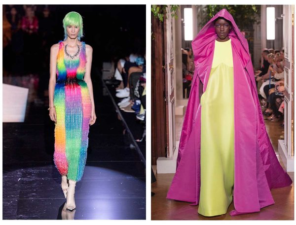 سيطرت الألوان الزاهية على فساتين فالنتينو Valentinoالموقعة من Pierpaolo Piccioli، بالرغم من أنّ المجموعة مخصصة لموسم خريف وشتاء 2019 – 2020. فقد هيمنت على الفساتين تدرّجات عدّة كالأخضر الليموني والبرتقالي والأرجواني والأصفر. وتجلّى موضوع الفرادة وأهميّته فيها، إذ عمد المصمّم إلى تبنّي الألوان المشرقة بهدف نفح بعض الروح في أيام الشتاء الباردة وجعلها تنبض بالحياة.