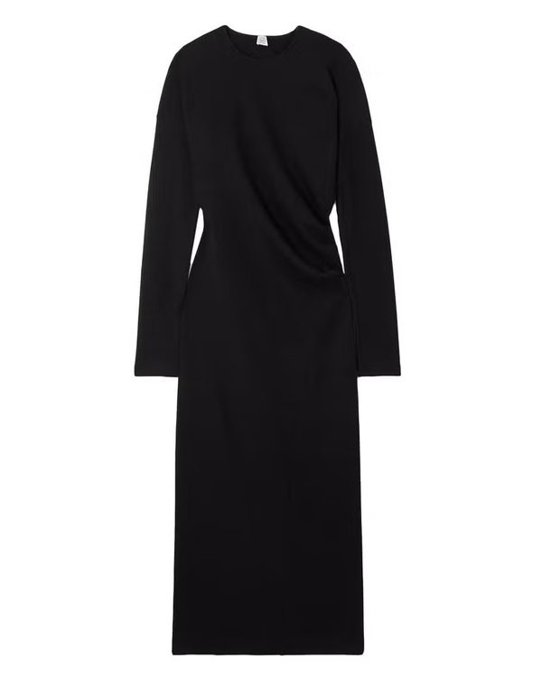 بغض النظر عن الموسم، فإن الفستان الأسود الجاهز للارتداء هو استثمار ذكي دائمًا. إنه تصميم مثالي من توتيم لفصل الشتاء، بأكمام طويلة وصدرية ملفوفة. يمكنك ارتداؤه بسهولة من النهار إلى الليل مع تبديل الإكسسوارات. فكري في ارتداء الأحذية الطويلة والأحذية ذات الكعب العالي للمكتب أو الصندل المرصع بالجواهر لحفل كوكتيل.
