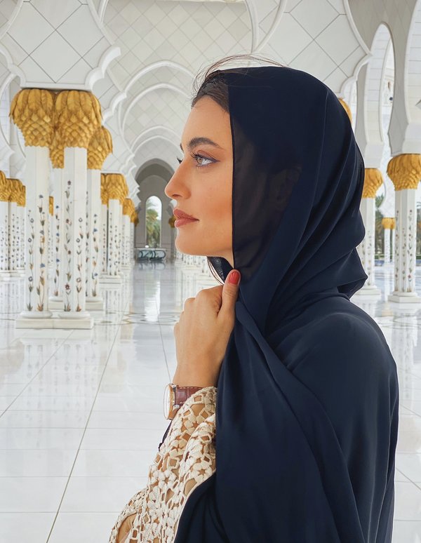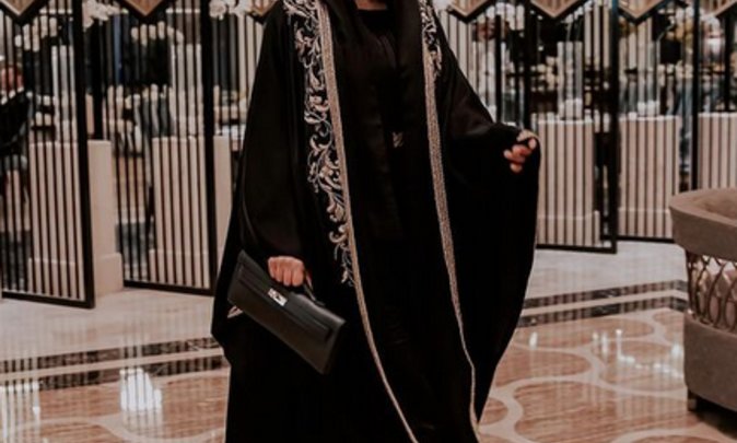 اختاري أن ترتدي العباية السوداء على طريقة علا فارس التي اختارتها بقصة واسعة ومريحة ومطرزة قليلاً عند الصدر.