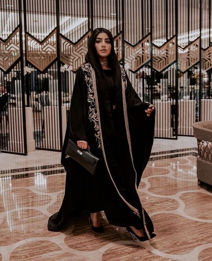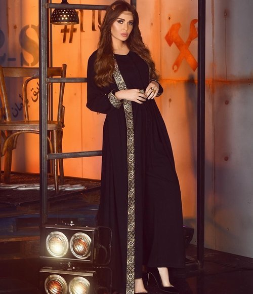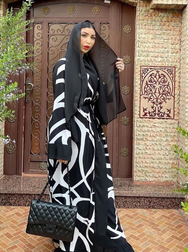 من الاطلالات المريحة هي العباية السوداء والتي يمكنك تنسيقها على طريقة دنيا بطمة وتختاري عباية باللونين الأبيض والأسود.