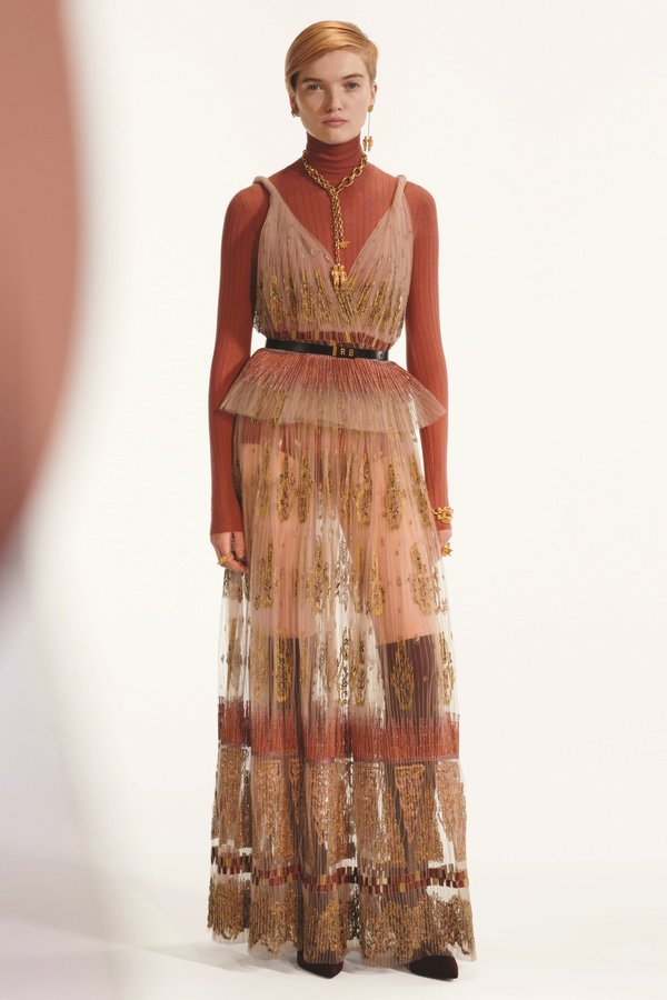 أمّا سترة Bar الكلاسيكيّة، فقد جاءت بلمسات أكثر عصريّة إذ دخل إليها صوف Shetland. وما يجعل هذه المجموعة مريحة للغاية وعصريّة، فهو استخدام الدانتيل والتول والتطريز والخرز. كذلك، برزت الأحذية التي تصل إلى حدود الركبة والتي تمّ تنسيقها مع تنانير شفّافة، والفساتين التي جاءت بألوان محايدة وبياقة عالية، ما أضفى على الإطلالة طابعاً كلاسيكيّاً بلمسة عصريّة. وتجدر الإشارة إلى أنّ مجموعة ما قبل الخريف هذه تضمّ قطعاً يمكن ارتداؤها بأكثر من طريقة سواء كانت سروالاً أو تنورة أو حتى فستاناً. وقد وضعت المصمّمة لمساتها الأخيرة من خلال الأكسسوارات الجريئة أي العقود والأقراط والخواتم والأساور، ما يجسّد تراث دار Dior إنّما بطريقة عصريّة.