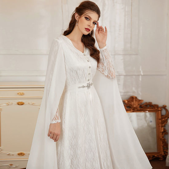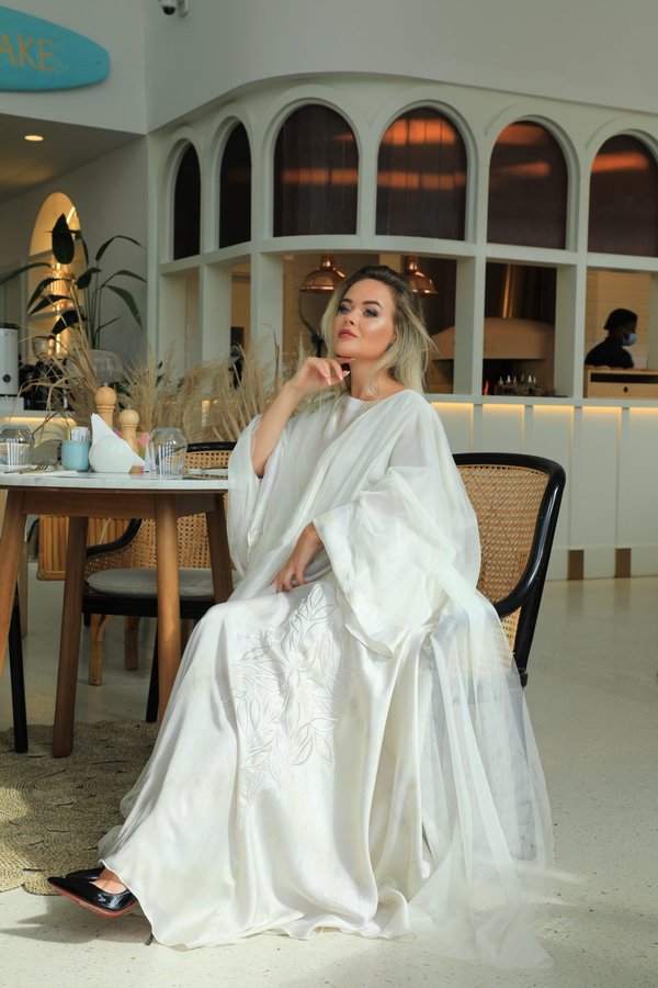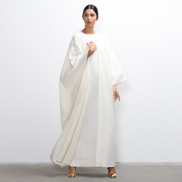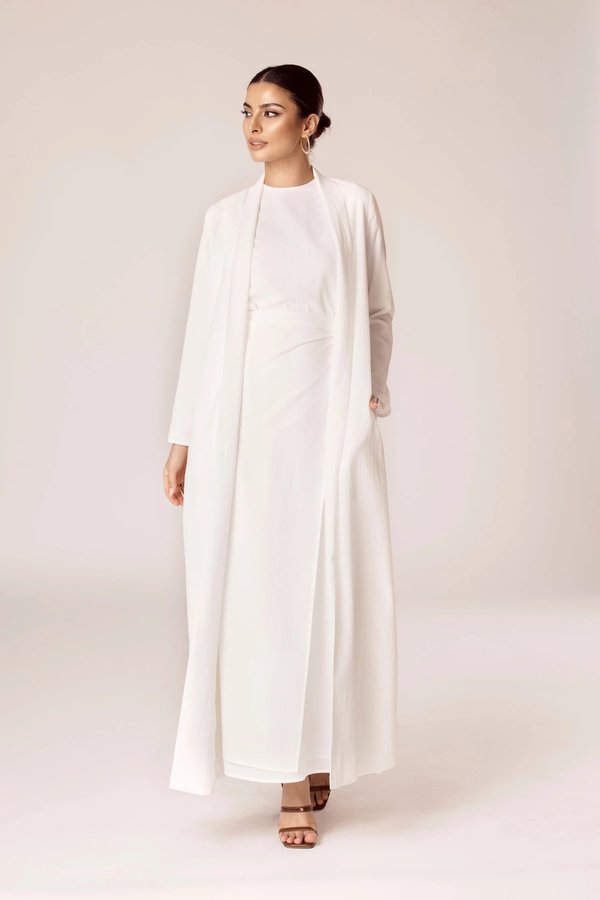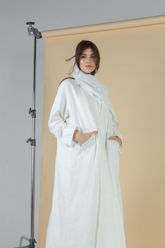 مع العباية المفتوحة البيضاء نسقي فستاناً أبيضاً من نفس نوع قماشة العياة ويمكن ان يكون بقصة ضيقة لإبراز جمال إطلالتك.