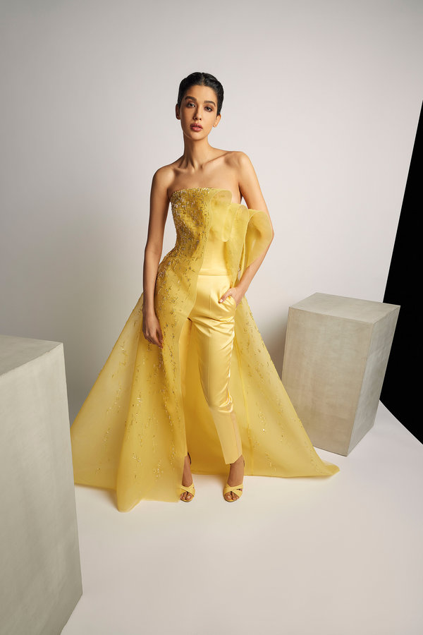 اختاري التصميم المميز الذي يناسبك مثلاً وقع اختيارنا على جمبسوت باللون الأصفر من المصم رامي العلي من دون اكمام مع ذيل يناسب الفستان.
