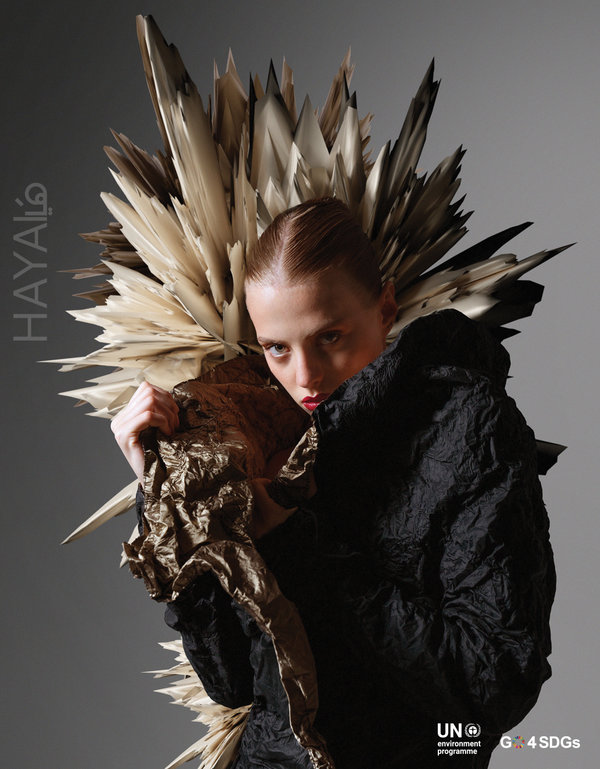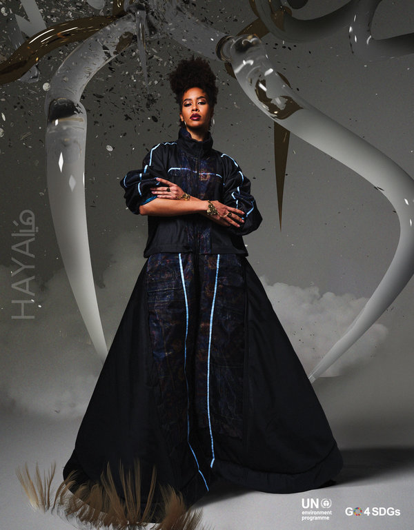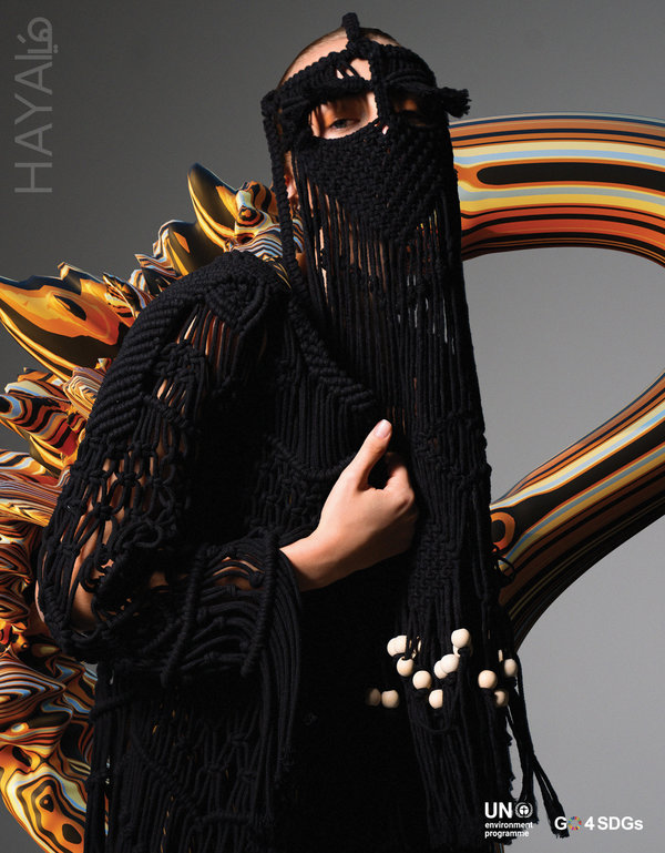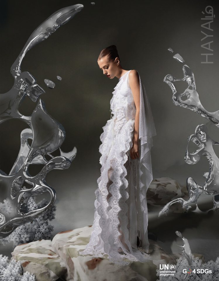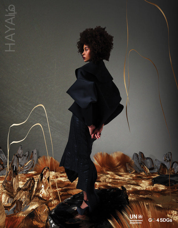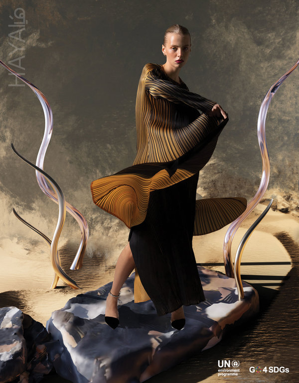 الهدف الرئيسي من برنامج تسريع التحول نحو الأزياء المستدامة في غرب آسيا هو التعاون مع مصممي أزياء ناشئين ومشهورين من منطقة غرب آسيا، للتصدّي للعراقيل التقنية والتجارية والإبداعية التي يواجهونها عند تطبيق الممارسات المستدامة. وفي هذا العدد من مجلة هَيا، ابتكر 5 مصممين مشاركين في هذا البرنامج إطلالات حصرية تعطي لمحة أولية عن تطبيق الاستراتيجيات الدائرية. وامتدّ الالتزام بالممارسات المستدامة أيضاً إلى جلسة التصوير، إذ تم اعتماد مناظر طبيعية افتراضية متنوعة تم ابتكارها بالتعاون مع الفنانة الرقمية Sophie Richardson، لعرض إطلالات المصممين بأقل قدر من الأثر الكربوني.