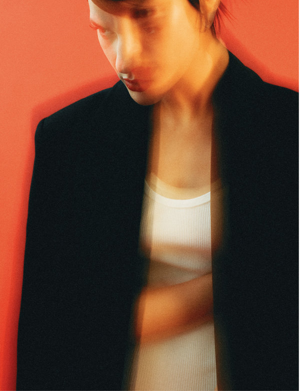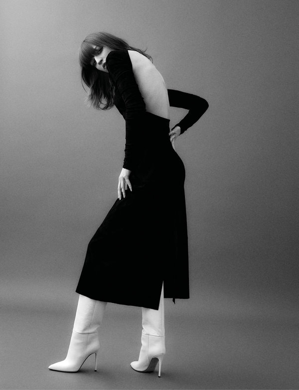 فستان أسود من الجلد السويدي بقَبّة عالية وظهر مفتوح من Ferragamo، جزمة بكعب stiletto الرفيع من الجلد الأبيض بنقشة جلد السحليّة من Paris Texas