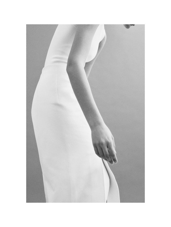 كات سوت بياقة ضيّقة من قماش الفيسكوز الأبيض المات من Ferragamo، تنّورة متوسّطة الطول من نسيج غبردين قطني من Sportmax