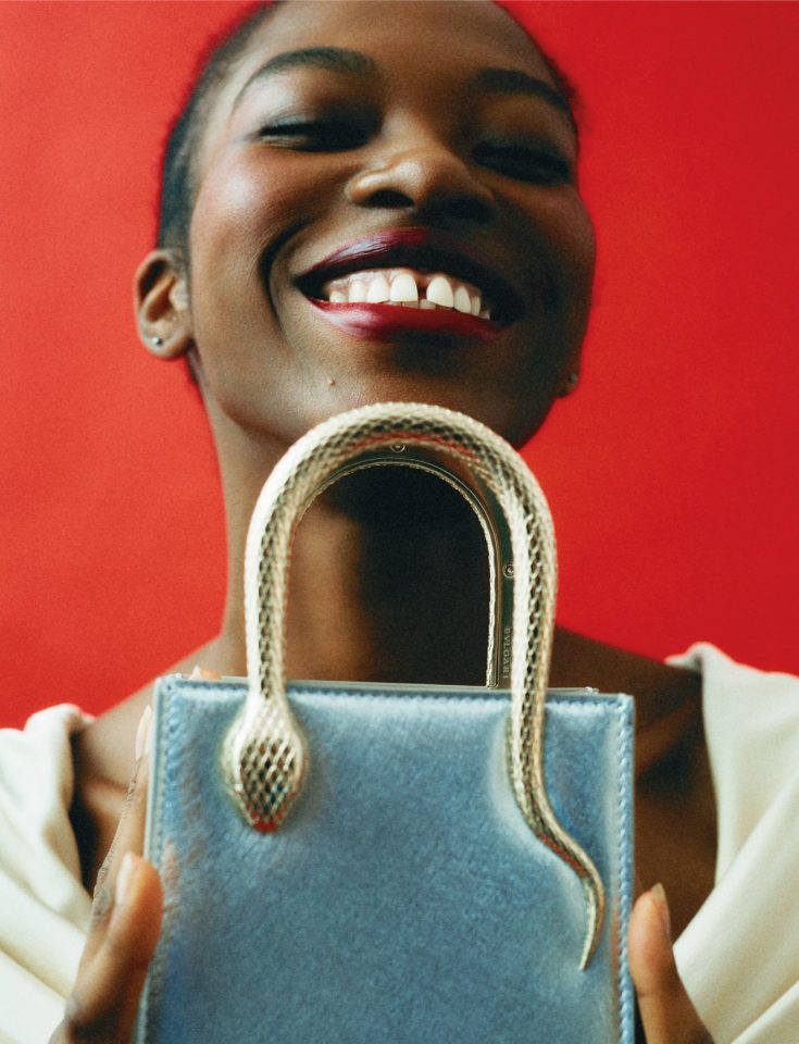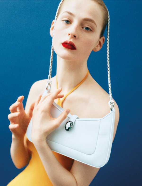 فستان أصفر من Stella McCartney، حقيبة Serpenti من جلد العجل من Bvlgari