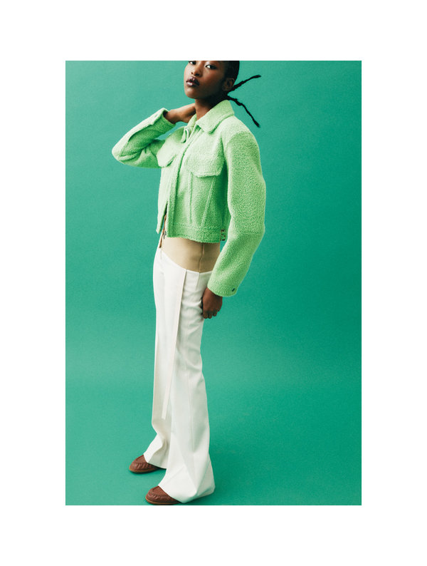 جاكيت shearling خضراء وسروال مخيّط حسب المقاس من Fendi، قميص محبوك وحذاء لوفر من الجلد من TOD's