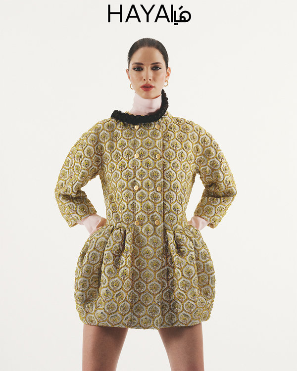 فستان أخضر على شكل معطف وقميص زهري بقبّة عالية، كلّها من Giambattista Valli