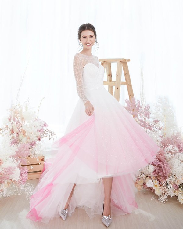 فستان عرس ناعم جداً للعروس الرومانسية ممزوج بين اللونين الأبيض والزهري.