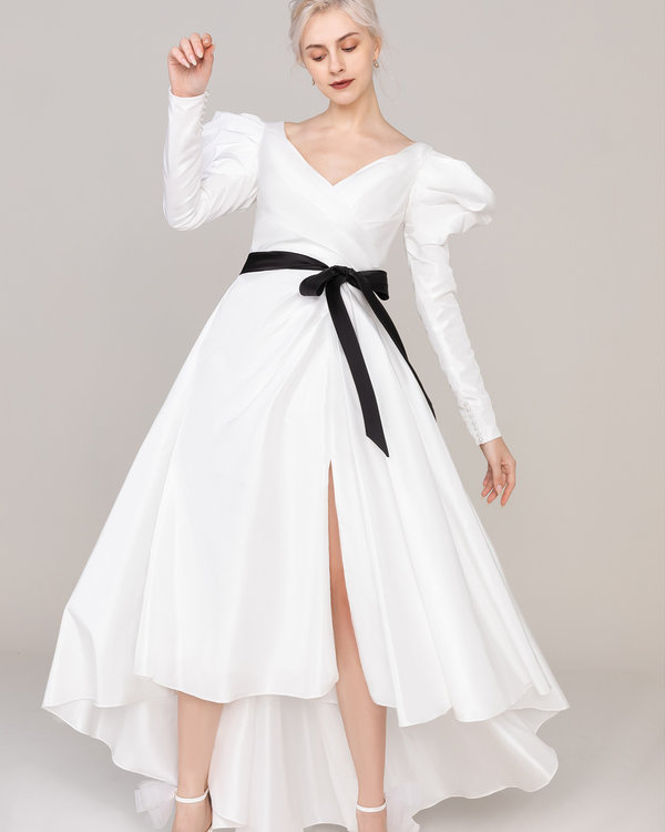فستان بأكمام طويله مع حزام باللون الأسود يمكنه تنسيق ليوم عقد القران.
