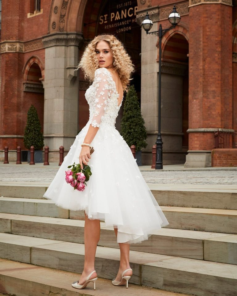 فستان زفاف كلاسيكي وناعم يتميز بأكمامه المطرزة بالورود الناعمة.
