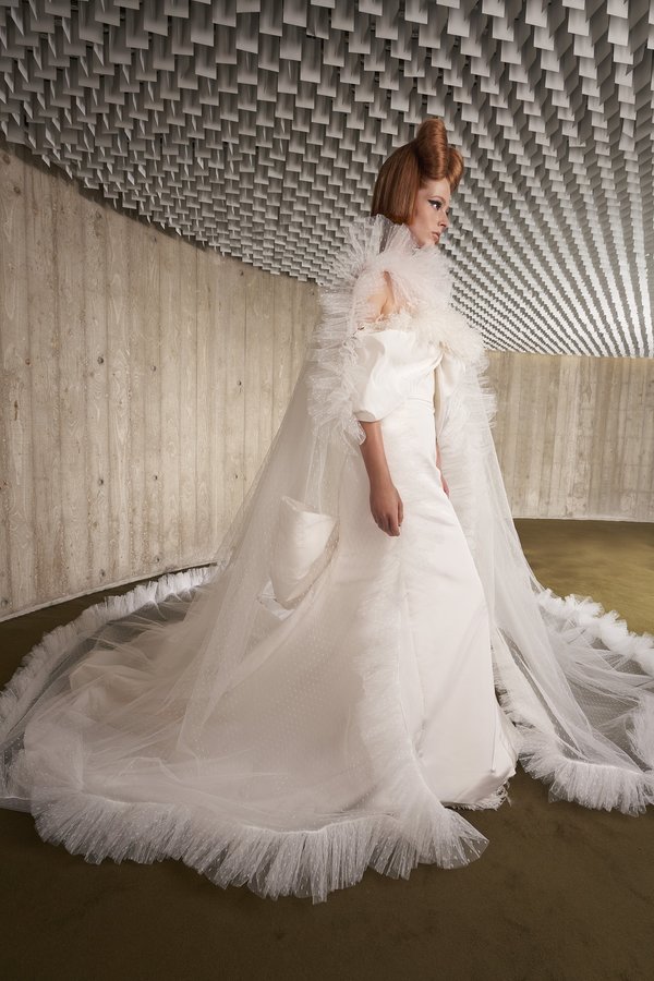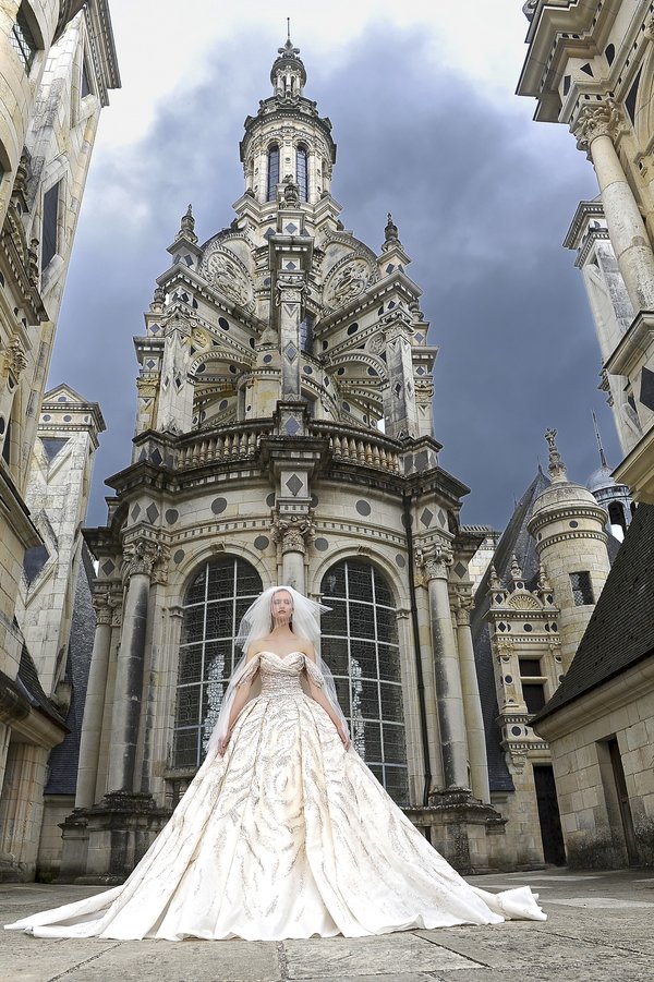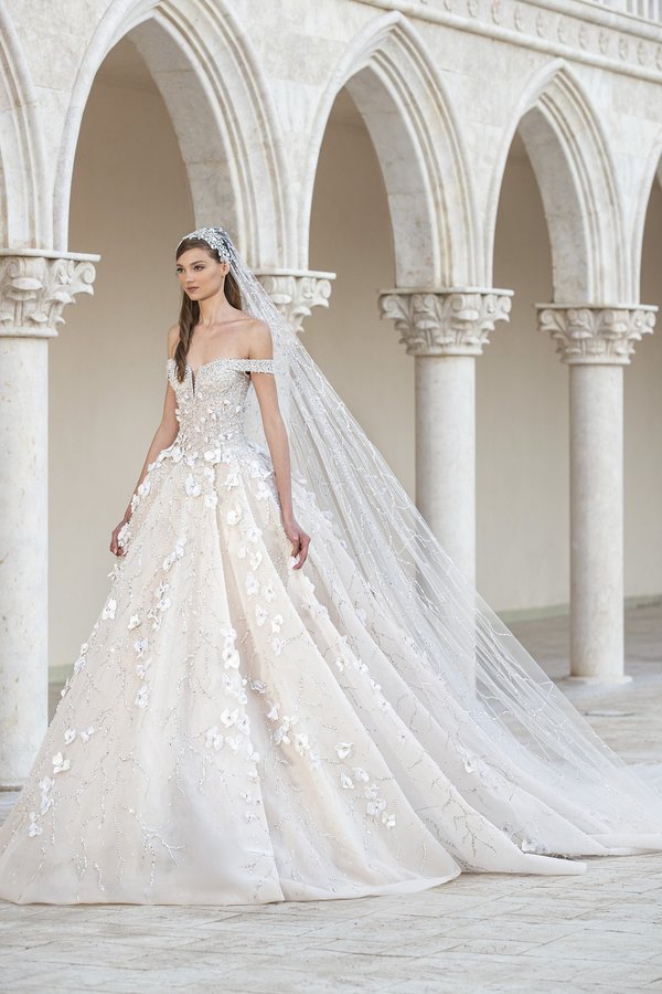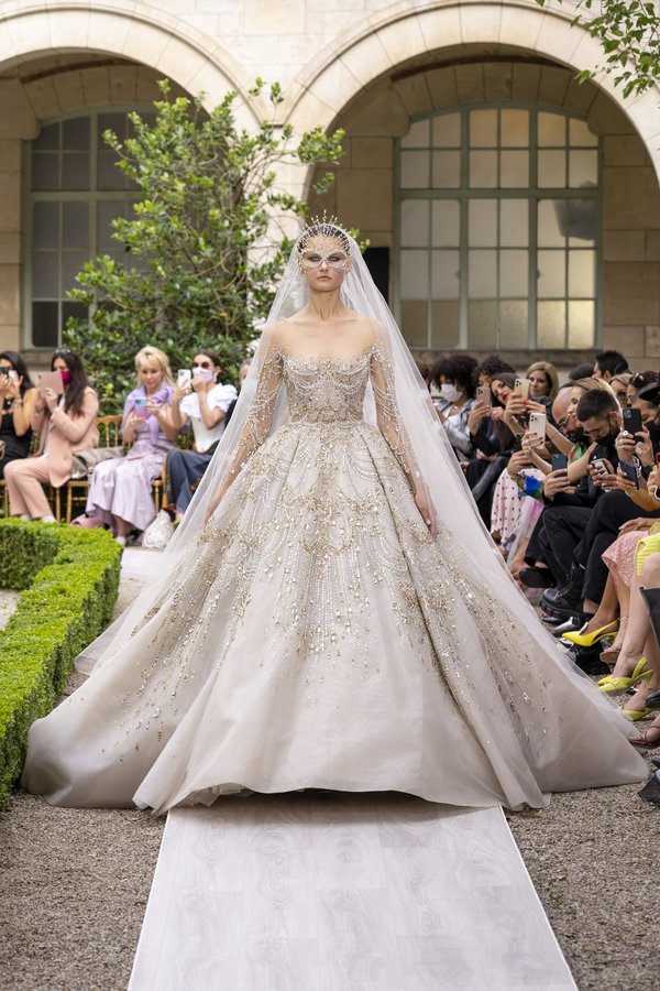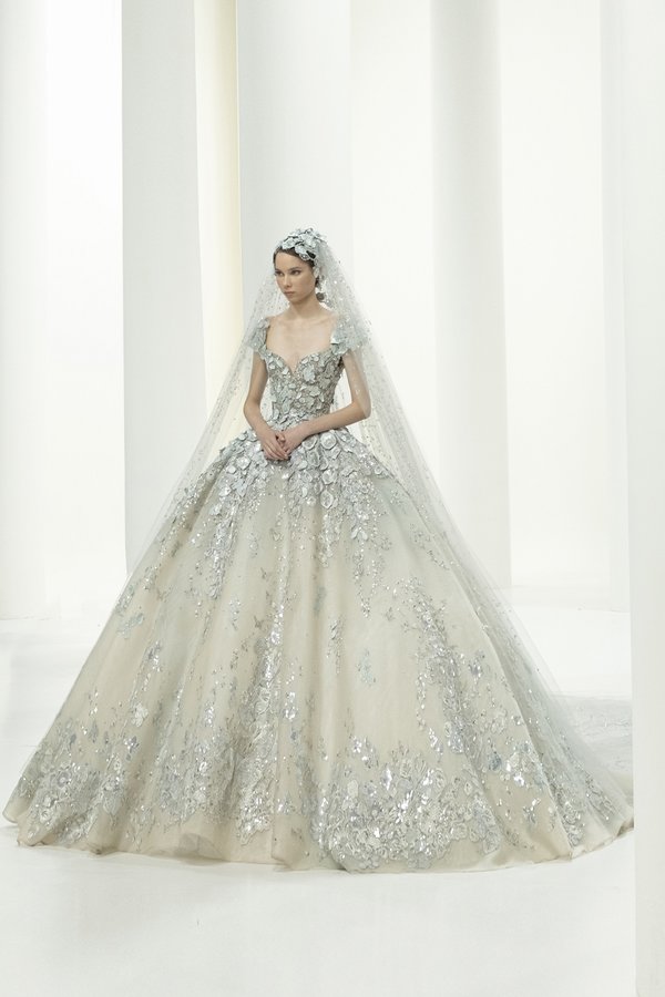 دائماً ما تكون عروس إيلي صعب متالقة وساحرة، ولشتاء 2021-2022 جاء فستان زفاف إيلي صعب مستوحى من عالم الأميرات، ذات القصة الملكية الرائعة. تميز بلونه ومزين بزخرفات فضية اللون، مع طرحة طويلة.