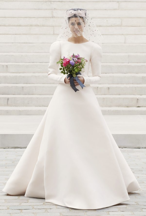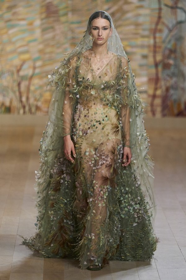 قدمت علامة Dior فستاناً مختلفاً كلياً للعروس، فأتى الفستان من القماش الملون الشفاف مزين بالريش، مع طرحة طويلة مصنوعة من التول والريش.