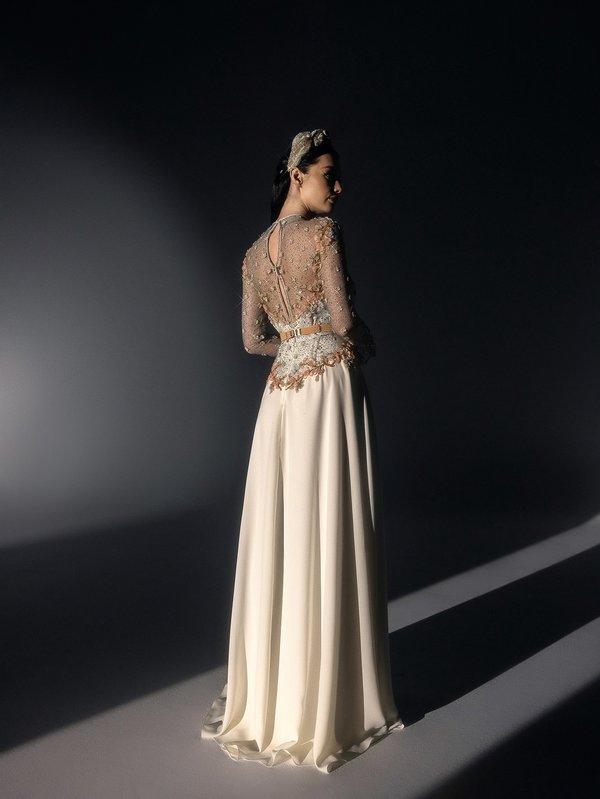 تضفي المجموعة الجديدة رونقاً أنيقاً يتحدّى قيود الزّمن بفعل امتزاج الدانتيل المتشابك مع الخيوط الفضية وتدفق الخرزات الذهبية فتتلألأ الفساتين في هذه المجموعة في تباين برّاق لتظهر جاذبية الذهب والفضة وتذكّرنا بالنجوم التي تضيء سماء الليل.