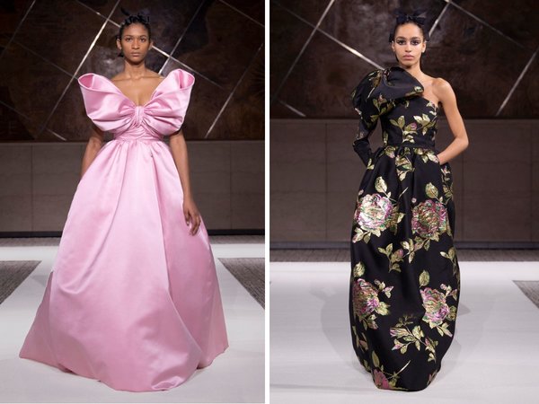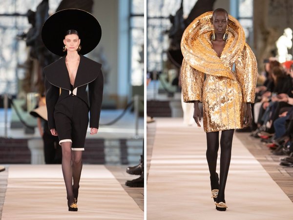 تحاكي التصاميم هويّة الدار، هيمن عليها ألوان الأسود، الأبيض والذهبي إلى جانب التفاصيل الملفتة مثل الياقات الجامدة والمبالغ بحجمها، العناصر الذهبية التي تداخلت في مختلف الأشكال في أكثر من تصميم، والتفاصيل المبتكرة مثل القبّعة التي ارتبطت بالفستان عبر قماش شفاف…