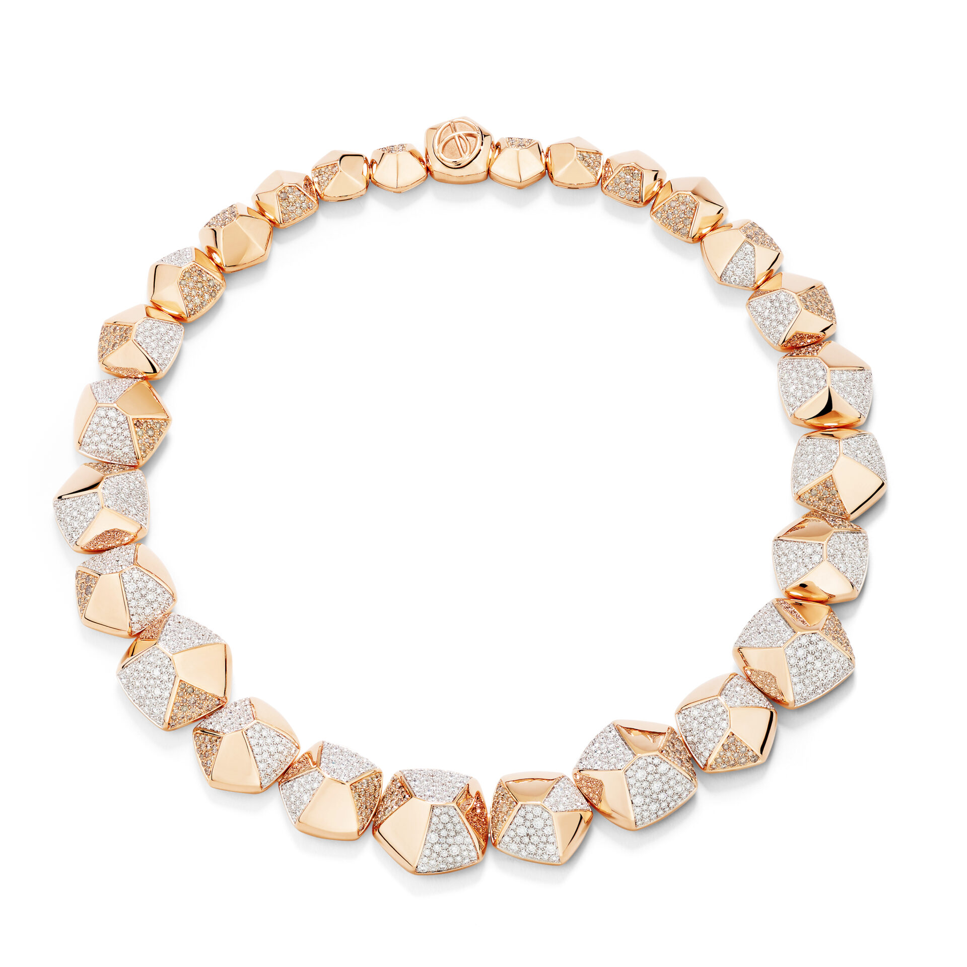 تحمل قطع هذه المجموعة بصمة Pomellato الأصيلة، تتصدّر القلادة المشهد كقطعة محورية، حيث تنساب الأشكال الخماسية بأحجام متباينة في تدرّج فاتن يلتف حول العنق كشلال من الأناقة العصرية.