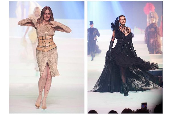 وفي تفاصيل المجموعة، استلهم Gaultier تصاميمه من الأشياء التي دائماً ما كان يفضلها وتشير إلى أعماله السابقة، كالكورسيه المخروطي الأيقوني الذي ارتدته مادونا، الدنيم، تقليمات البحّارة التي اشتهر بها وجعلها قطعاً راقية في الهوت كوتور والفستان البلاستيكي الذي حوّل العارضة إلى دمية لن تنسى.