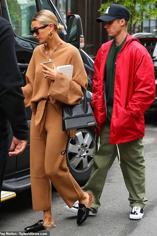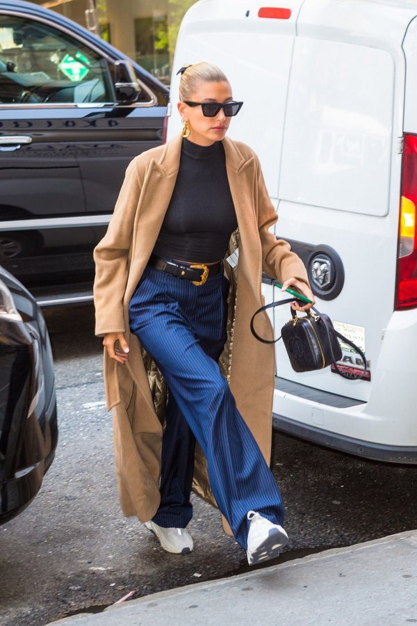 لاحظنا أن هايلي تكرر اعتماد ملابس اللون الواحد، ولتضفي حيوية أكثر تعتمد الأكسسوارات البارزة كالحقيبة الكبيرة والأقراط الكبيرة أيضاً.