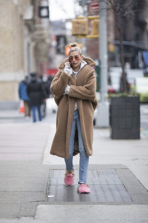 لأيام البرد والشتاء، لا بد أن تختاري الملابس المريحة والتي تشعرك بالدفء في الوقت نفسه. ويعتبر الـTeddy Coat من أبرز القطع التي تتربع على عرش الموضة وقد اختارته هايلي مع سروال من الجينز.