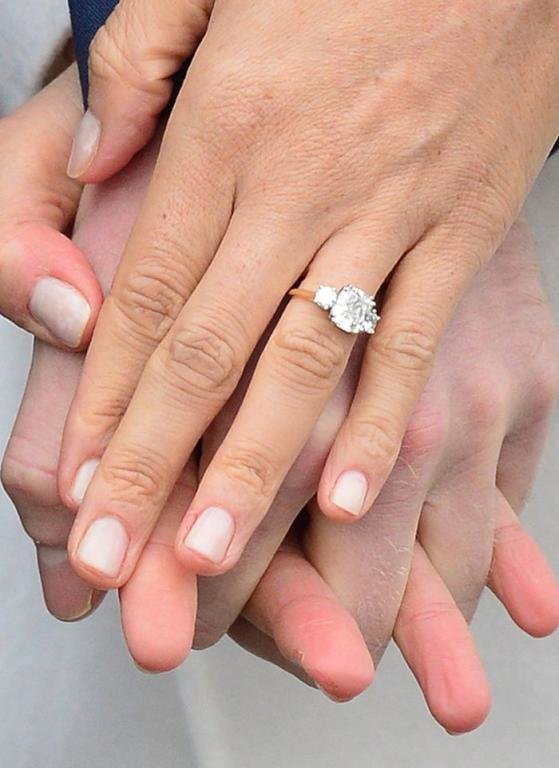 تقدَّم لها الأمير هاري بخاتم مكون من حجر أصفر في الوسط تحيط به ألماستان تعود ملكيتهما لوالدته الأميرة ديانا.