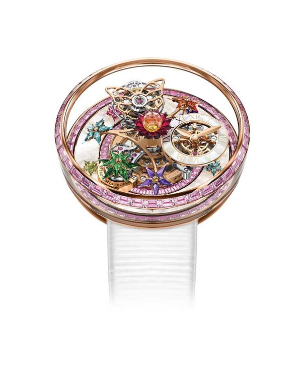 تتميّز هذه الساعة بألوانها، ما يجعلها قطعة أنثويّة للغاية تتضمّن في طيّاتها 11 نوعاً من الأزهار، تجسّدها أحجار الجمشت والزفير الوردي والأزرق والعقيق البرتقالي والياقوت وغيرها. وتدور هذه الأزهار بشكل معاكس لعقارب الساعة حول لؤلؤة كبيرة. وتجدر الإشارة إلى أنّ هذه القطعة مغطّاة بالكامل بأحجار الياقوت الوردي، ما يضفي عليها مزيداً من الأناقة والأنثويّة. تتوافر ساعة Fleurs de Jardin بشكل محدود وهي ساعة خالدة لا يحدّها زمن وقطعة مجوهرات