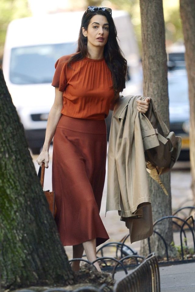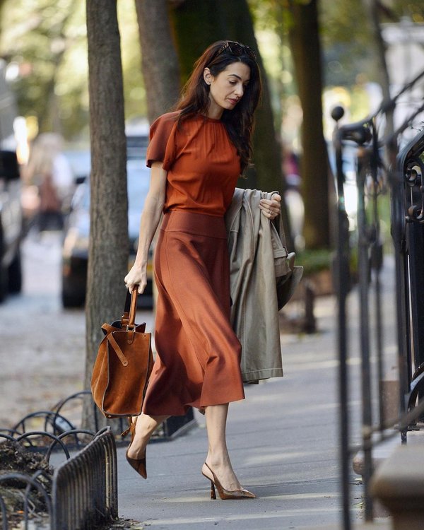 مرّة جديدة، ها هي أمل كلوني تسير في شوارع نيويورك وهي تعتمد إطلالة خريفية مميزة إن من ناحية الستايل أو من ناحية الألوان. بتنورة تصل إلى الركبة تتميز بلونها البني وتوب من اللون نفسه رصدت عدسات الكاميرا زوجة جورج كلوني.