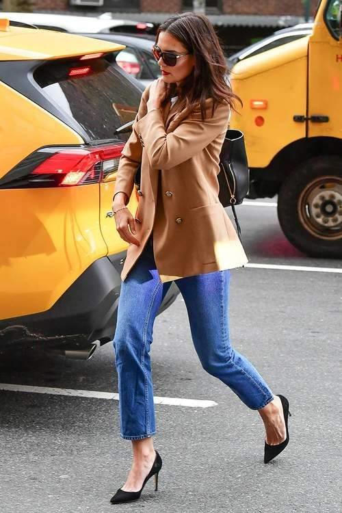 من جانبها، فاجأتنا النجمة كيتي هولمز باللوك الذي اعتمدته في نيويورك. وفي التفاصيل، اختارت لوكاً مثالياً لموسم الخريف. فقد نسقت سروالاً من الجينز تميز بقصته الواسعة مع جاكيت متوسطة الطول باللون البني وحذاء بالكعب العالي.