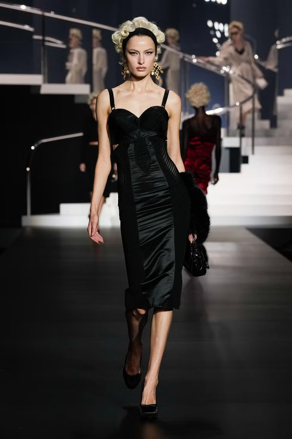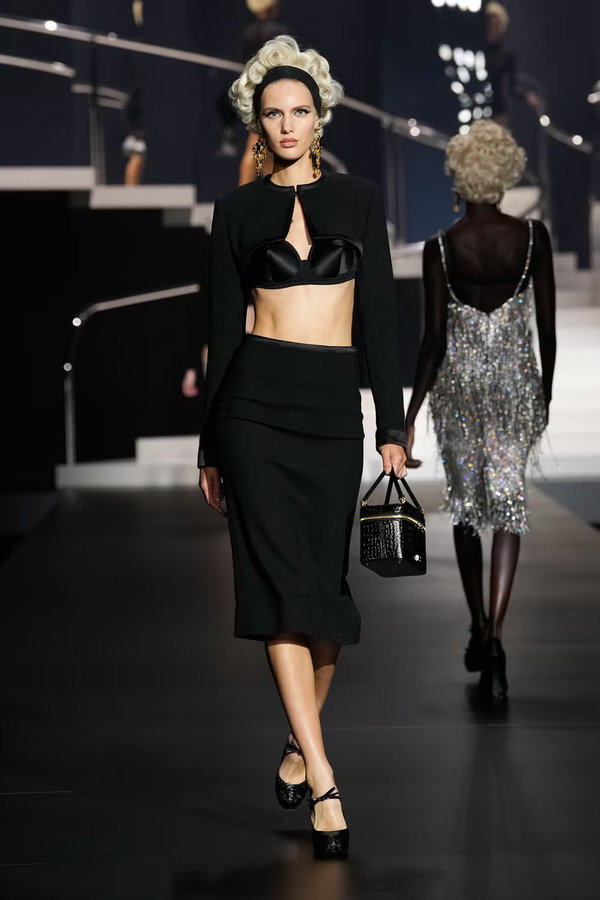 من عالم مادونا وأزيائها، استوحت العلامة Dolce & Gabbana عرضها مستلهمة من إطلالة النجمة في التسعينات بفستانها بقصدة الصدر الخاصة به والذي جعل المجموعة أشبه بتكريمٍ لهذا اللوك.