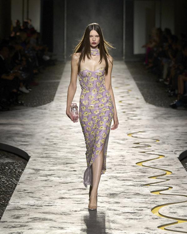 أحبت Donatella Versace أن تطل على محبيها من قلعة سفورزيسكو حيث قدمت عرضها الذي بدا وكأنه لوحة قماشيّة تُجسّد المطبوعات، والتي هي اللّغة البصرية السّائدة لدى Versace من خلال تجميع خمس رسومات رمزية.