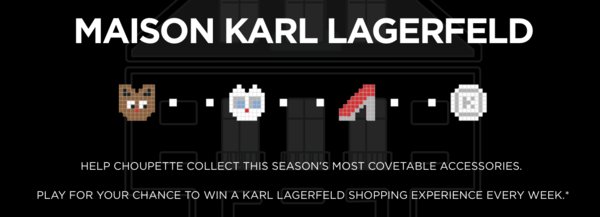 يسر دار Karl Lagerfeld إطلاق لعبة Maison KARL LAGERFELD ، التي يمكن تحميلها على كافة أنواع الأجهزة الذكية. وفي تفاصيل اللعبة، يجب على اللاعب مساعدة Choupette في التنقل عبر طريق دار Karl Lagerfeld الشهير في 21 Rue St-Guillaume في باريس ، حيث تبحث عن أنماط هذا الموسم الضرورية التي لا غنى عنها. والهدف هو جمع أكثر عدد ممكن من النقاط، إذ يمكن لـ Choupette أيضاً تسجيل نقاط إضافية من خلال جمع قطع المصمم الأيقوني الخاصة به مثل النظارات الشمسية، الكاميرا، حقيبة اليد ، رقمه المفضّل "رقم 7" وبرج إيفل.