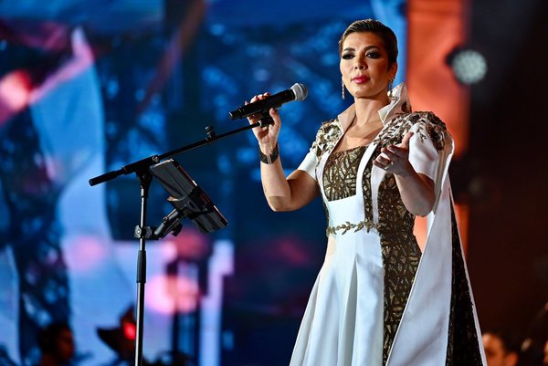 محطتنا الثانية، مع أنغام التي التقت جمهورها ضمن صيف الشرقية. حيث اعتمدت أنغام إطلالة محتشمة، وهي عبارة عن فستان اسود طويل تميز بأكمامه الطويلة والشفافة ذات التطريزات المميزة. من تصميم راني زاخم.