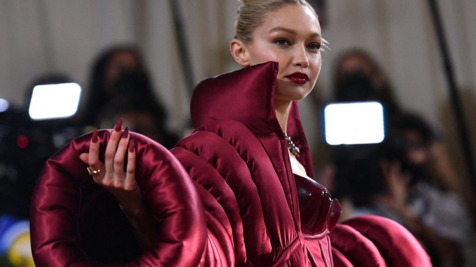 أما جيجي حديد أطلت بجبسوت أحمر اللون مع كاب من الفرو الطويل من Versace.