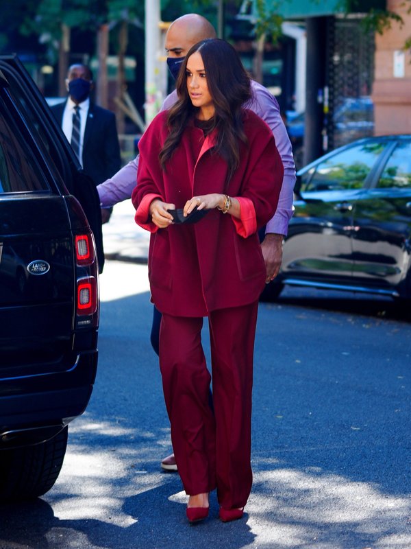 خلال زيارة الثنائي إلى مركز التجارة العالمي، اعتمدت ميغان ماكل إطلالة باللون الأسود في ستايل عملي للغاية. نسقت كنزة بياقة عالية مع سروال عالي الخصر ذات القصة الواسعة مع معطف. إطلالتها هذه أتت من علامة Giorgio Armani.