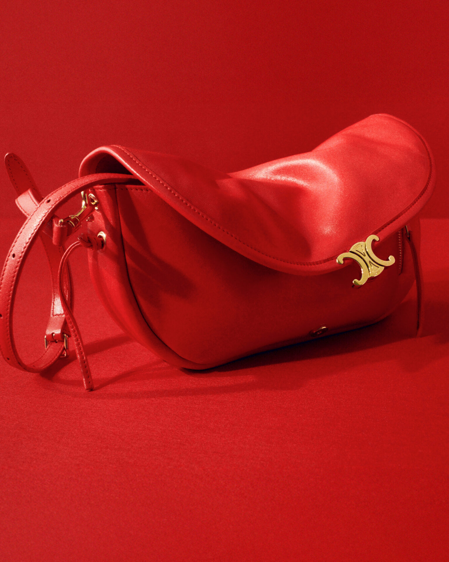 تتميز هذه الجقيبة بتصميم انسيابي مقوس ومصنوع من جلد الحمل الناعم واللامع، وتزدان بقفل CELINE الأيقوني مع حزام رفيع قابل للتعديل.