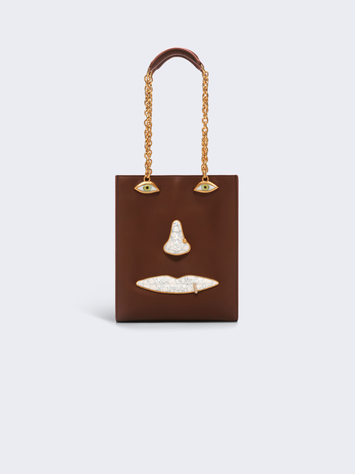 تأتي الحقيبة من جلد العجل الفاخر بدرجات التوب أو الأسود، ببنية مزدوجة العملية، تتوّجها مقابض على شكل سلاسل bijoux تضفي عليها طابعاً أقرب إلى قطع المجوهرات. وعلى سطحها، تتوزع أزرار معدنية وحجرية لتشكّل ملامح وجه بأسلوب trompe-l’œil، في معالجة فنية سريالية تعبّر بوضوح عن هوية الدار الجريئة.