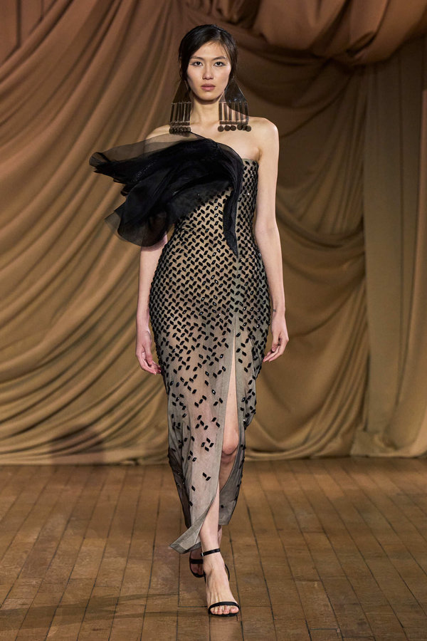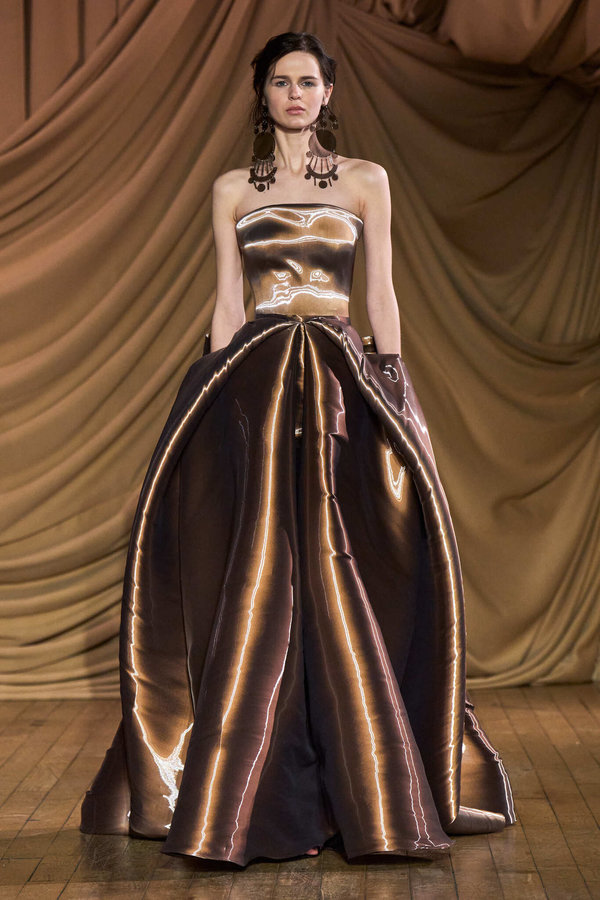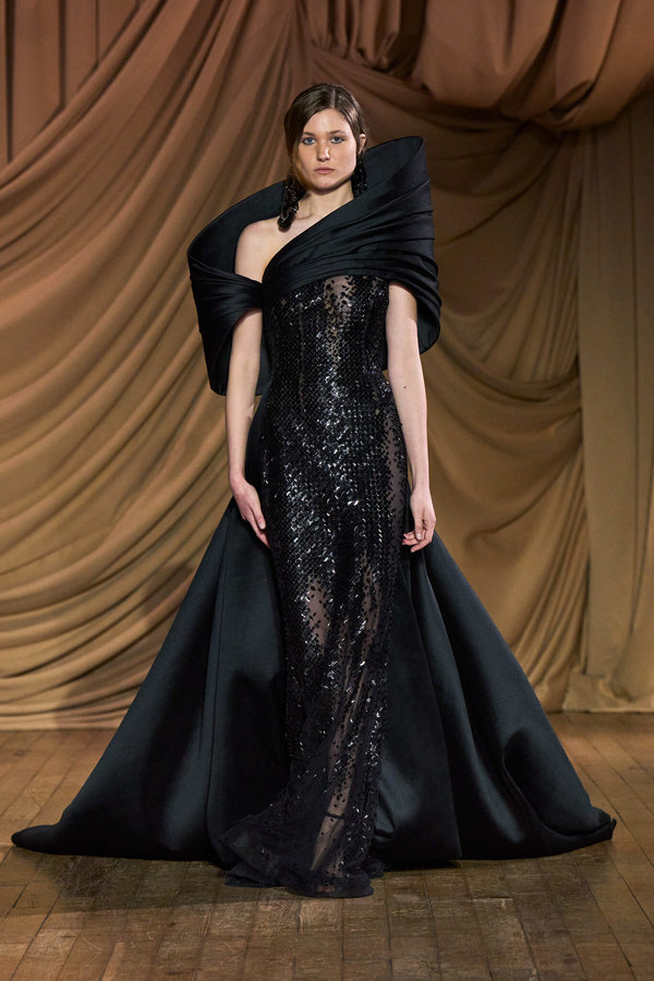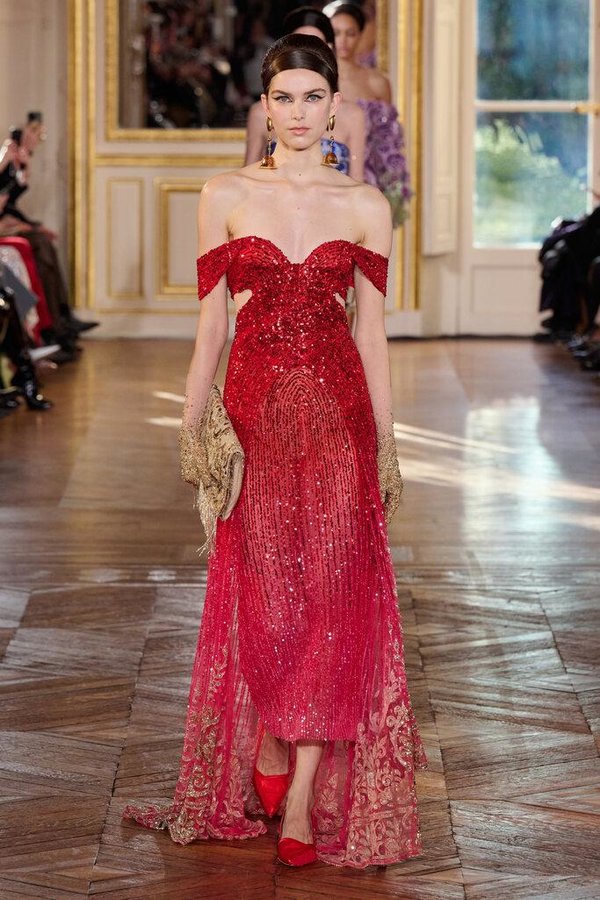 بين القصات المكشوفة عند الكتف، أفخر أنواع الأقمشة وأجودها من الحرير الناعم والأورجانزا والقطن والتول، إضافة إلى أقمشة الساتان البرّاقة وحرير الجازار كلها رسمت ملامح مفهوم الأنوثة العصرية التي أراد المصمم تجسيدها.