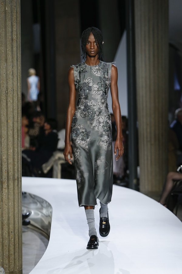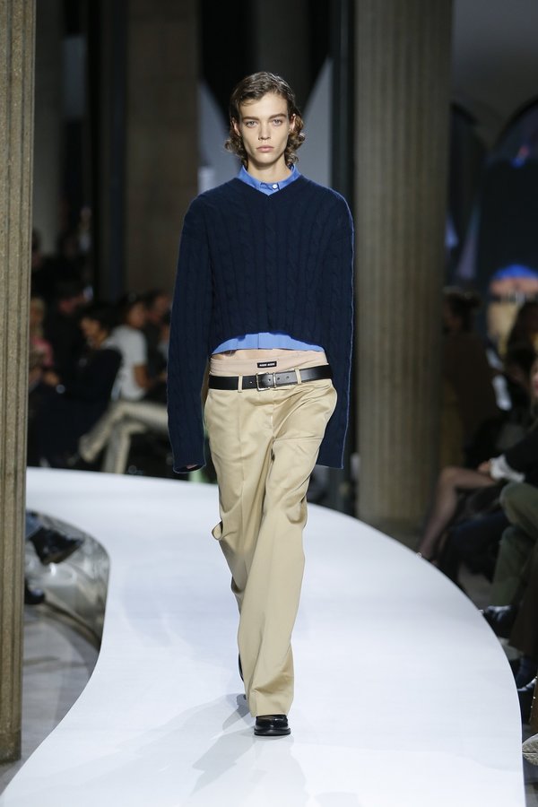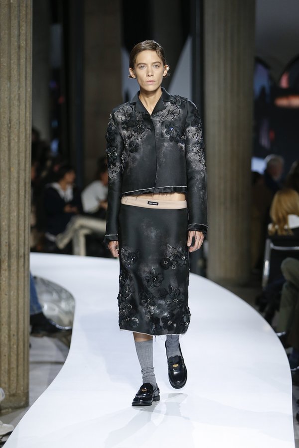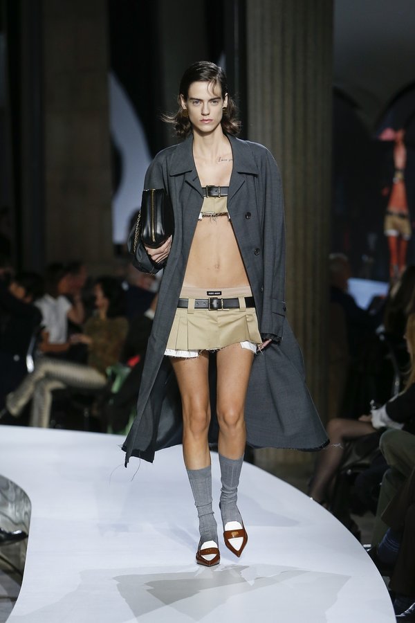 التنانير القصيرة جدّاً مع الحواف غير المحدّدة والمقصوصة هذه التنانير شاءت أن تنسّقها ميوتشيا مع السترات القصيرة على منطقة البطن أو جاكيت البلايزر والقميص الأبيض الذي يذكّرنا بالطابع العملي والكلاسيكي.