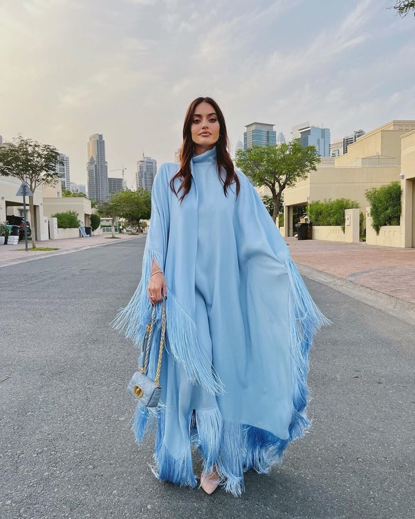 أنابيلا هلال اعتمدت قفطاناً باللون الأزرق مع لمسة من الحيوية من الشراريب.