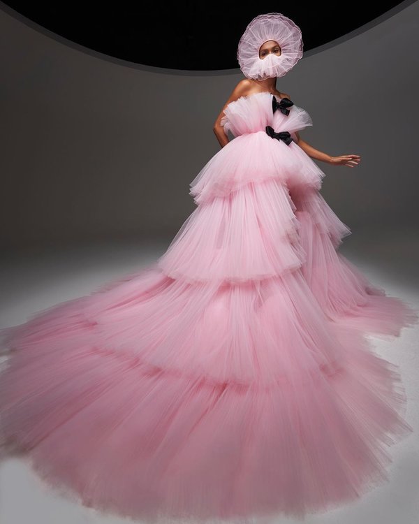 في تفاصيل مجموعة خريف وشتاء 2020-2021، لم تستغني الدار عن الأساسيات: التول المنفوش، ربطات الفيونكا، القصات الضخمة، الكثير من الطبقات واللون الزهري.