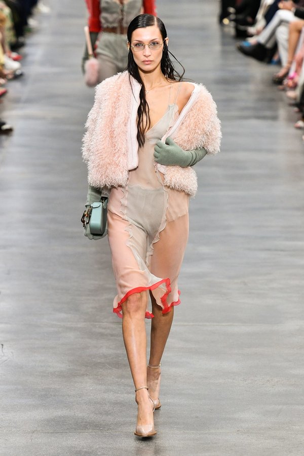 افتتاح العرض كان مع بيلا حديد التي اعتمدت إطلالة شفافة عبارة عن فستان نت القماش الشفاف الناعم نسقته مع جاكيت من الفرو.