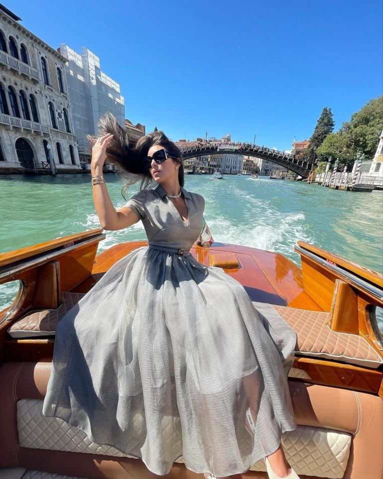 ياسمين صبري شاركت متابعيها على إنستغرام بلوكين مختلفين: فخلال انتقالها لمكان إقامة المهرجان، أطلت بفستان رمادي اللون.